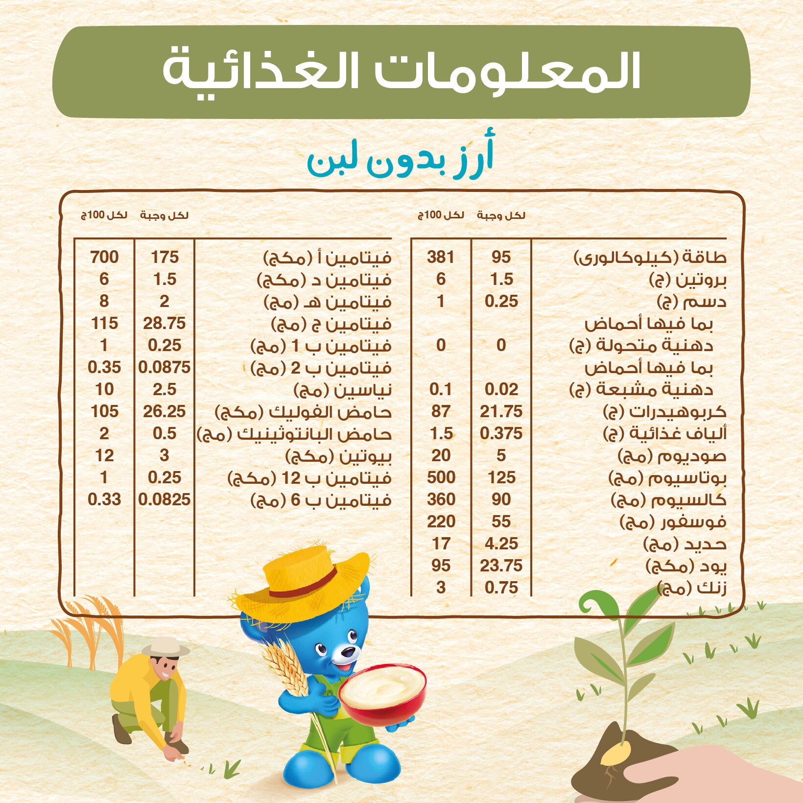 دقيق الأرز ، سكروز، نكهة (فانيلين)، فيتامينات( فيتامين ج ، فيتامين هـ، نياسين، فيتامين ب5، فيتامين ب1، فيتامين أ، فيتامين ب2، فيتامين ب6، حمض الفوليك، بيوتين، فيتامين د، فيتامين ب12)، المعادن ( كربونات الكالسيوم، فوسفات البوتاسيوم، فومارات الحديدوز، كلوريد الصوديوم، كبريتات الزنك، يوديد البوتاسيوم)